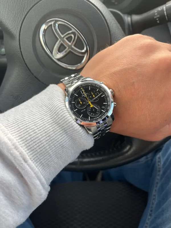 Мужские швейцарские часы представляют собой высококачественный аксессуар в спортивном стиле, ярко-желтая секундная стрелка и стрелки счётчиков придают аксессуару особую привлекательность.