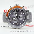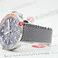 Наручные часы отличаются спортивным дизайном, прослеживается дайверская тематика, чему способствует и водонепроницаемость при давлении 30 бар на глубине 300 метров. Кварцевый механизм ETA G10.212. Керамический безельБезельВнешний ободок, закрепляющий стекло. В спортивных часах так называется поворотное кольцо с делениями на циферблате, выполняет роль таймера – замеряет отрезки времени на шкале. Неподвижный безель – элемент декора. Однонаправленно вращающийся безель на дайверских часах позволяет фиксировать моменты погружения и выныривания на поверхность. Сапфировое стекло с антибликовым покрытием. Завинчивающаяся заводная головка и задняя крышка. Люминесцентная подсветкаЛюминесцентное покрытиеПозволяет считывать показания времени в темноте. Производители наносят на стрелки, часовые индексы, безель или поверхность циферблата светонакопительный состав, дающий холодное свечение.. Серый тканевый ремешок. Секундомер, хронографХронографФункция позволяет измерять отрезки времени с особой точностью: часы, минуты, секунды. Верным признаком хронографа является наличие на циферблате 3 дополнительных окошек-счётчиков., календарь. Габариты: 45 x 45 x 12,8 мм.