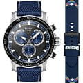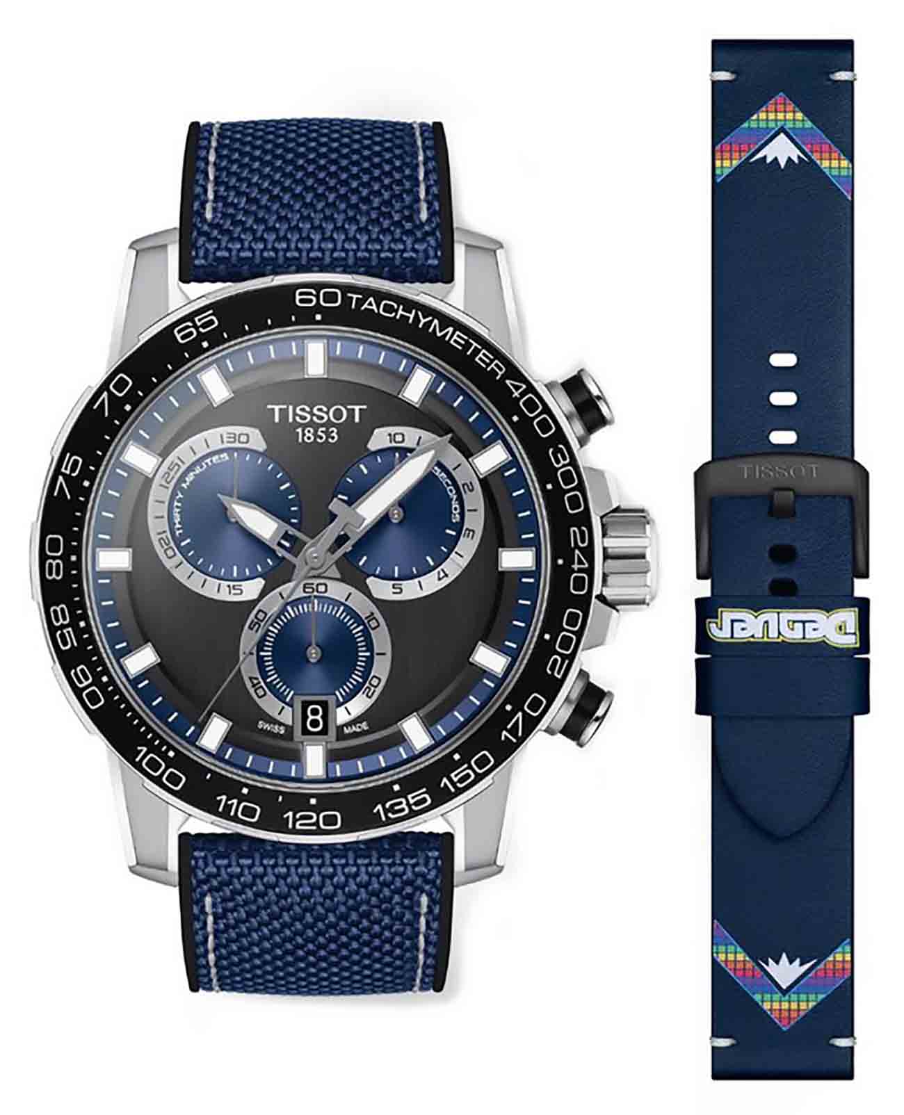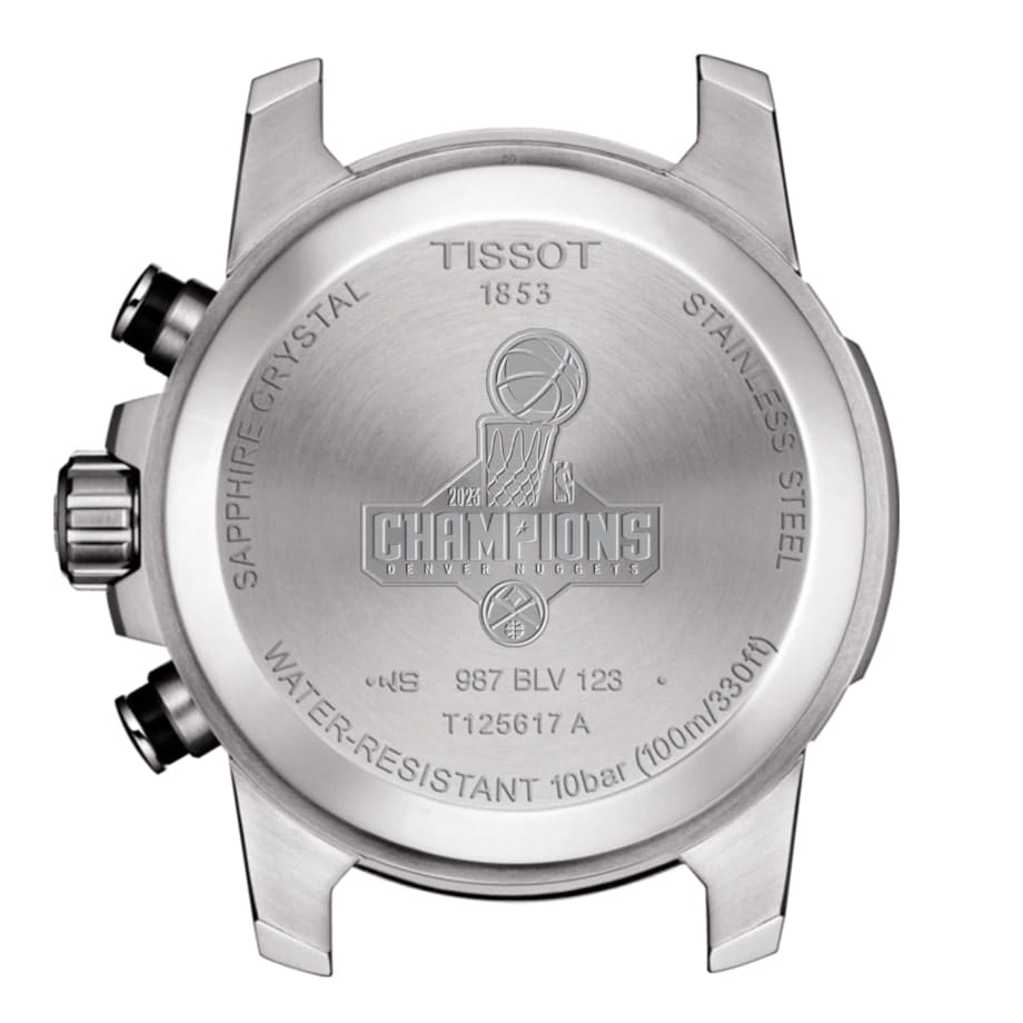 Tissot отмечает чемпионство НБА выпуском часов Denver Nuggets 2023 NBA Champions Supersport Chrono. Эти часы — квинтэссенция современной спортивности: большой хронограф (45,5 мм) с кварцевым механизмом и внушительные индексы обеспечивают лучшую видимость времени и придают глубину циферблату. Эти часы, выпущенные ограниченным тиражом, имеют заднюю крышку с гравировкой и дополнительный кожаный ремешок Denver Nuggets в память о чемпионах НБА 2023 года и их выступлениях на площадке. Массивный циферблат с крупной индикацией времени, симметричным расположением окошек – важная деталь для делового мужчины, привыкшего всё делать вовремя. Швейцарский кварцевый механизм. Сапфировое стеклоСапфировое стеклоПрочный и надёжный материал из кристалла сапфира синтетического происхождения, характеризующийся особой твёрдостью и устойчивостью к царапинам и повреждениям.. Корпус из нержавеющей стали 316L. БезельБезельВнешний ободок, закрепляющий стекло. В спортивных часах так называется поворотное кольцо с делениями на циферблате, выполняет роль таймера – замеряет отрезки времени на шкале. Неподвижный безель – элемент декора. Однонаправленно вращающийся безель на дайверских часах позволяет фиксировать моменты погружения и выныривания на поверхность. размечен шкалой тахиметраТахиметрРазмеченная шкала, располагается на ободке или безеле часов. Тахиметр позволяет рассчитать скорость на определённом участке пути, расстояние измеряется в километрах или милях.. Водонепроницаемость до 10 бар. Люминесцентная подсветкаЛюминесцентное покрытиеПозволяет считывать показания времени в темноте. Производители наносят на стрелки, часовые индексы, безель или поверхность циферблата светонакопительный состав, дающий холодное свечение.. СекундомерСекундомерСекундоме́р — прибор, способный измерять интервалы времени с точностью до долей секунды., хронографХронографФункция позволяет измерять отрезки времени с особой точностью: часы, минуты, секунды. Верным признаком хронографа является наличие на циферблате 3 дополнительных окошек-счётчиков., индикация числа. Длина и ширина корпуса: 45,5 мм.