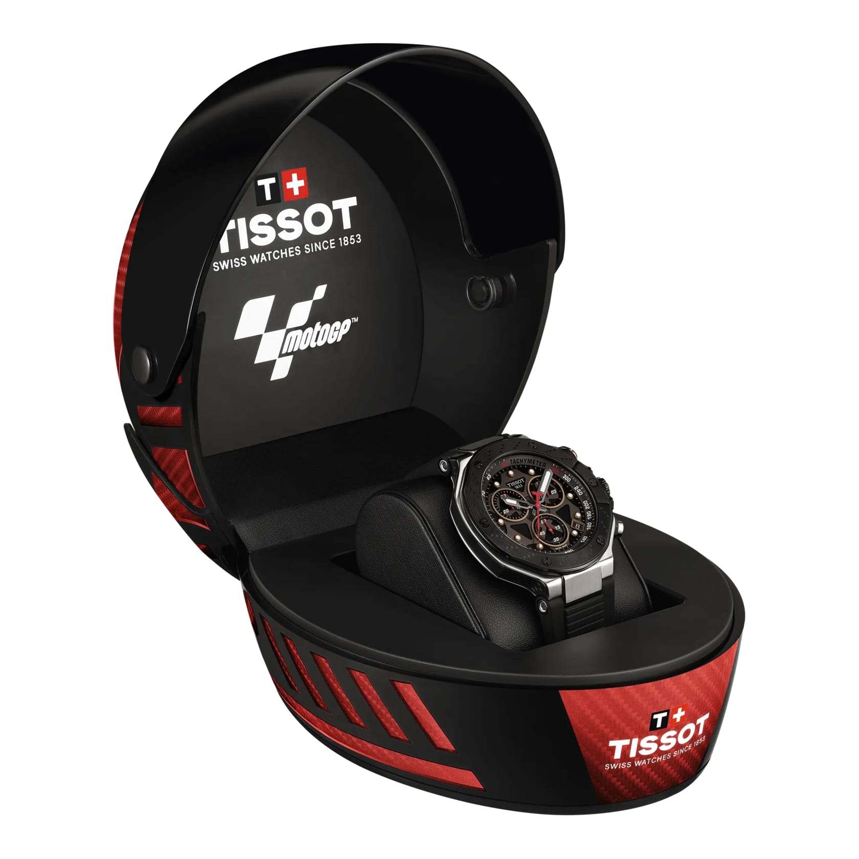 Tissot T-Race MotoGP Quartz Chronograph T141.417.27.081.00 – лимитированная серия мужских часов, выпущенная в количестве 8 000 экземпляров, посвященная сотрудничеству Tissot с чемпионатом MotoGP™. Корпус диаметром 45 мм выполнен из нержавеющей стали 316L и безельБезельВнешний ободок, закрепляющий стекло. В спортивных часах так называется поворотное кольцо с делениями на циферблате, выполняет роль таймера – замеряет отрезки времени на шкале. Неподвижный безель – элемент декора. Однонаправленно вращающийся безель на дайверских часах позволяет фиксировать моменты погружения и выныривания на поверхность. с PVD-покрытиемPVDУльтратонкое покрытие наносится в технике вакуумного напыления, сочетает в себе нитрид титана особой прочности со слоем золота или оксида хрома. Несёт в себе декоративную или защитную функцию. в чёрном цвете, придающим часам современный и спортивный вид. Глубокий циферблат защищён сапфировым стекломСапфировое стеклоПрочный и надёжный материал из кристалла сапфира синтетического происхождения, характеризующийся особой твёрдостью и устойчивостью к царапинам и повреждениям. с антибликовым покрытиемАнтибликовое покрытиеСлой оксида металла в 0,13-0,3 микрон, благодаря которому стекло часов не бликует и не отражает свет. Антибликовое покрытие уменьшает отражение света в 10 раз, обеспечивая отличную читаемость показателей циферблата., обеспечивающим устойчивость к царапинам и отличную читаемость в любых условиях. Задняя крышка корпуса украшена гравировкой, подчеркивающей уникальность модели. Часы оснащены швейцарским кварцевым механизмом, обеспечивающим высокую точность хода. Функциональность модели включает хронографХронографФункция позволяет измерять отрезки времени с особой точностью: часы, минуты, секунды. Верным признаком хронографа является наличие на циферблате 3 дополнительных окошек-счётчиков. с центральной секундной стрелкой, 30-минутным и 1/10-секундным счетчиками, а также функциями ADD и сплит-хронографаСплит-хронографИспользуется для измерения продолжительности нескольких временных отрезков, начинающихся одновременно, а заканчивающихся в разное время.. Индексы и стрелки покрыты люминесцентным покрытиемЛюминесцентное покрытиеПозволяет считывать показания времени в темноте. Производители наносят на стрелки, часовые индексы, безель или поверхность циферблата светонакопительный состав, дающий холодное свечение. Super-LumiNova®, обеспечивающим отличную видимость в темное время суток. Чёрный силиконовый ремешок с классической застёжкой обеспечивает комфортное ношение и надёжную фиксацию на запястье. Водозащита до 100 метров (10 бар) позволяет использовать часы во время плавания и других водных видов спорта. Эта модель идеально подходит для поклонников MotoGP™ и ценителей высококачественных швейцарских часов с уникальным дизайном и расширенной функциональностью.