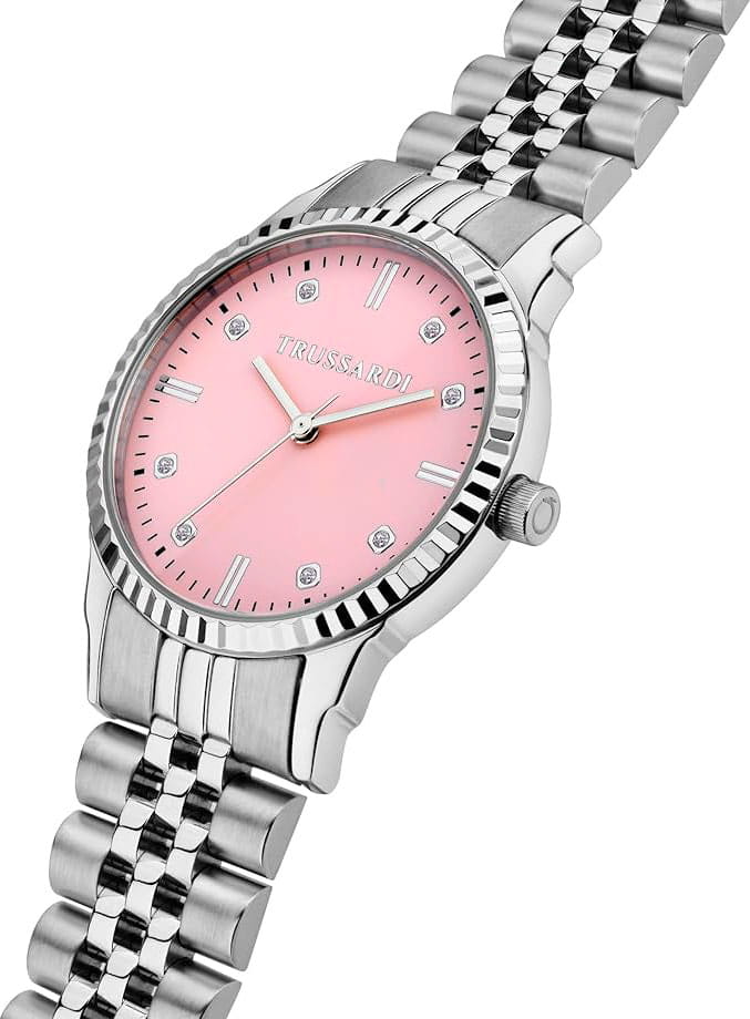 Итальянские женские часы Trussardi T-Bent R2453144510 - это стильный женский аксессуар, который сочетает элегантный дизайн и практичность. Корпус выполнен из нержавеющей стали, что обеспечивает долговечность и утончённый внешний вид. БезельБезельВнешний ободок, закрепляющий стекло. В спортивных часах так называется поворотное кольцо с делениями на циферблате, выполняет роль таймера – замеряет отрезки времени на шкале. Неподвижный безель – элемент декора. Однонаправленно вращающийся безель на дайверских часах позволяет фиксировать моменты погружения и выныривания на поверхность. с алмазной гранью. Надежное минеральное стеклоМинеральное стеклоМинеральное стекло представляет собой искусственно выращенный минерал кварца. Такое стекло отличается особой устойчивостью к повреждениям и царапинам. Уступает по некоторым качествам сапфировому стеклу. защищает циферблат с кристаллами от царапин и обеспечивает долговечность. Модель оснащена кварцевым механизмом, обеспечивающим высокую точность хода. Браслет из нержавеющей стали на раскладной застёжкеРаскладная застёжкаТакой тип застёжки используется только на браслетах из металла. Она никогда не раскрывается полностью, происходит разделение на 2 и более частей. Раскладывающая застёжка снизит вероятность потери часов к минимуму. обеспечивает комфортное ношение. Водозащита 50 метров позволит защитить корпус от случайных брызг или капель дождя. Эта модель – отличный выбор для тех, кто ищет сочетание стиля, качества и функциональности. Часы станут не только полезным аксессуаром, но и выразительным элементом вашего имиджа. В комплекте браслет.