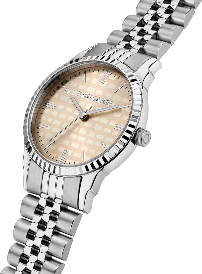 Итальянские женские часы Trussardi T-Bent R2453144512 - это стильный женский аксессуар, который сочетает элегантный дизайн и практичность. Корпус выполнен из нержавеющей стали, что обеспечивает долговечность и утончённый внешний вид. БезельБезельВнешний ободок, закрепляющий стекло. В спортивных часах так называется поворотное кольцо с делениями на циферблате, выполняет роль таймера – замеряет отрезки времени на шкале. Неподвижный безель – элемент декора. Однонаправленно вращающийся безель на дайверских часах позволяет фиксировать моменты погружения и выныривания на поверхность. с алмазной гранью. Надежное минеральное стеклоМинеральное стеклоМинеральное стекло представляет собой искусственно выращенный минерал кварца. Такое стекло отличается особой устойчивостью к повреждениям и царапинам. Уступает по некоторым качествам сапфировому стеклу. защищает циферблат от царапин и обеспечивает долговечность. Модель оснащена кварцевым механизмом, обеспечивающим высокую точность хода. Браслет из нержавеющей стали на раскладной застёжкеРаскладная застёжкаТакой тип застёжки используется только на браслетах из металла. Она никогда не раскрывается полностью, происходит разделение на 2 и более частей. Раскладывающая застёжка снизит вероятность потери часов к минимуму. обеспечивает комфортное ношение. Водозащита 50 метров позволит защитить корпус от случайных брызг или капель дождя. Эта модель – отличный выбор для тех, кто ищет сочетание стиля, качества и функциональности. Часы станут не только полезным аксессуаром, но и выразительным элементом вашего имиджа. В комплекте браслет.