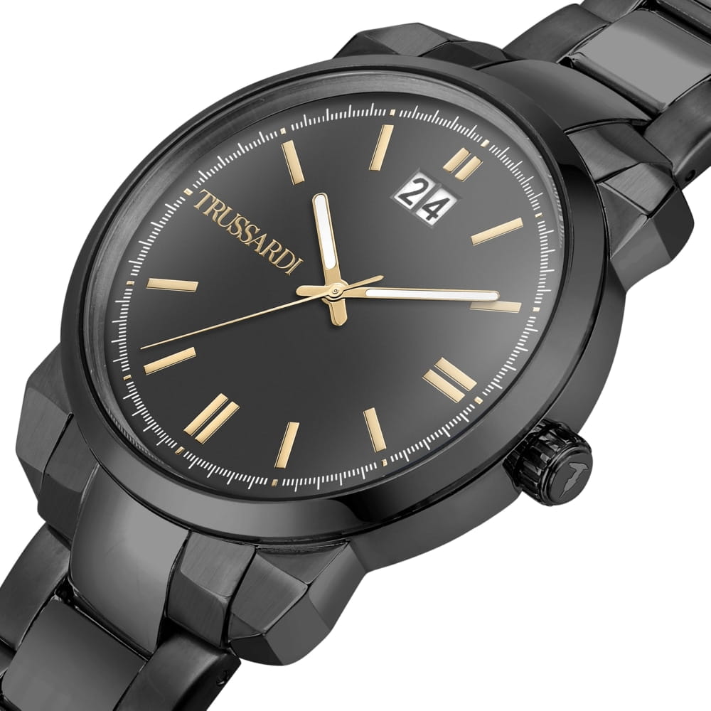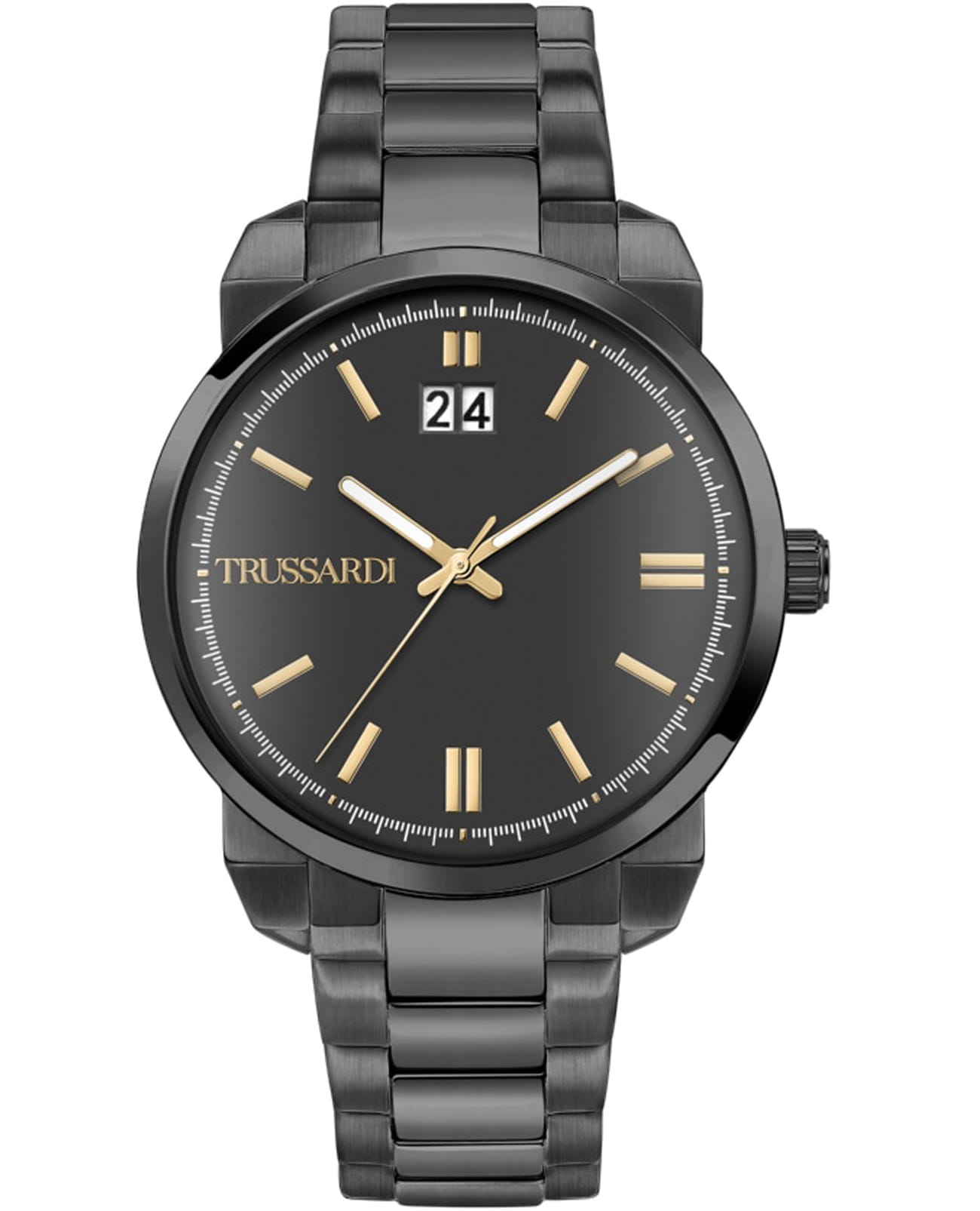 Итальянские мужские часы Trussardi T-City R2453154004 - это стильный мужской аксессуар, который сочетает элегантный дизайн и практичность. Корпус выполнен из нержавеющей стали с IP-покрытиемIP-покрытиеМетод ионного напыления. Демонстрирует повышенную устойчивость к истиранию, окислению и химическим веществам. Под воздействием высокого давления и температуры около 1500°C молекулы металла надёжно соединяются с частицами корпуса часов., что обеспечивает долговечность и утончённый внешний вид. Надежное минеральное стеклоМинеральное стеклоМинеральное стекло представляет собой искусственно выращенный минерал кварца. Такое стекло отличается особой устойчивостью к повреждениям и царапинам. Уступает по некоторым качествам сапфировому стеклу. защищает циферблат от царапин и обеспечивает долговечность. Модель оснащена кварцевым механизмом, обеспечивающим высокую точность хода. Браслет из нержавеющей стали с IP-покрытиемIP-покрытиеМетод ионного напыления. Демонстрирует повышенную устойчивость к истиранию, окислению и химическим веществам. Под воздействием высокого давления и температуры около 1500°C молекулы металла надёжно соединяются с частицами корпуса часов.  с раскладной застёжкойРаскладная застёжкаТакой тип застёжки используется только на браслетах из металла. Она никогда не раскрывается полностью, происходит разделение на 2 и более частей. Раскладывающая застёжка снизит вероятность потери часов к минимуму. обеспечивает комфортное ношение. Водозащита 50 метров позволит защитить корпус от случайных брызг или капель дождя. Стрелки оснащены люминесцентным покрытиемЛюминесцентное покрытиеПозволяет считывать показания времени в темноте. Производители наносят на стрелки, часовые индексы, безель или поверхность циферблата светонакопительный состав, дающий холодное свечение., обеспечивающим отличную видимость даже при слабом освещении. Окошко даты в положении 12 часов. Эта модель – отличный выбор для тех, кто ищет сочетание стиля, качества и функциональности. Часы станут не только полезным аксессуаром, но и выразительным элементом вашего имиджа. В наборе с часами идет кожаная кредитница.