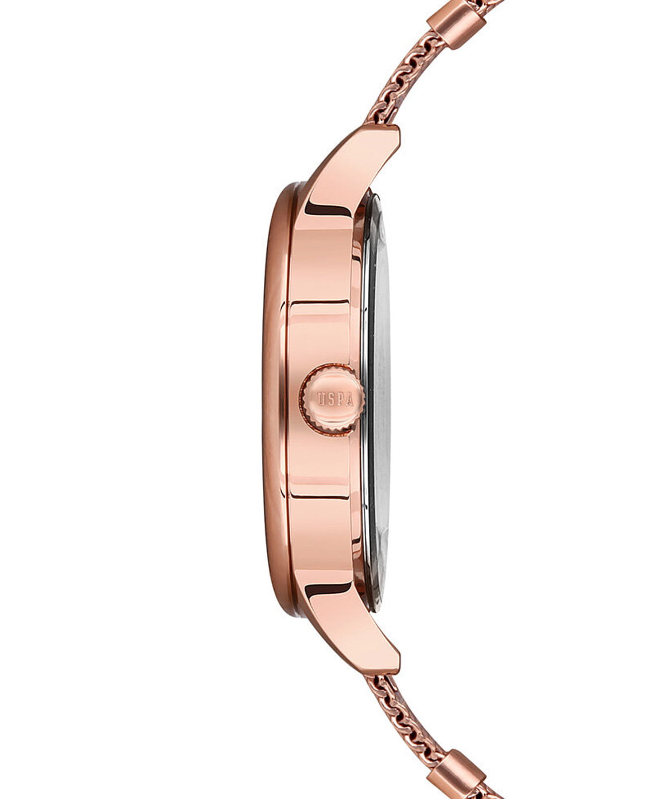 Женские часы U.S. Polo Assn USPA2010-01, кварцевый механизм с высокой точностью. Минеральное стеклоМинеральное стеклоМинеральное стекло представляет собой искусственно выращенный минерал кварца. Такое стекло отличается особой устойчивостью к повреждениям и царапинам. Уступает по некоторым качествам сапфировому стеклу. устойчивое к появлению царапин, обладающее высокой прозрачностью. Корпус изготовлен из нержавеющей стали с IP-покрытиемIP-покрытиеМетод ионного напыления. Демонстрирует повышенную устойчивость к истиранию, окислению и химическим веществам. Под воздействием высокого давления и температуры около 1500°C молекулы металла надёжно соединяются с частицами корпуса часов.. 24-х часовой формат времени, окошко даты и дня недели вынесены на отдельный циферблат. Класс водозащиты: 50 метров, позволит защитить корпус от случайных брызг или капель дождя. Стальной браслет миланского плетения с IP-покрытиемIP-покрытиеМетод ионного напыления. Демонстрирует повышенную устойчивость к истиранию, окислению и химическим веществам. Под воздействием высокого давления и температуры около 1500°C молекулы металла надёжно соединяются с частицами корпуса часов. на раскладном замкеРаскладной замокДанный вариант застежки используется только на часах с металлическим браслетом. Отличительная особенность такого крепления в том, что длина браслета становится универсальной и вы можете самостоятельно отрегулировать нужный вам размер – застежка просто двигается по браслету часов..