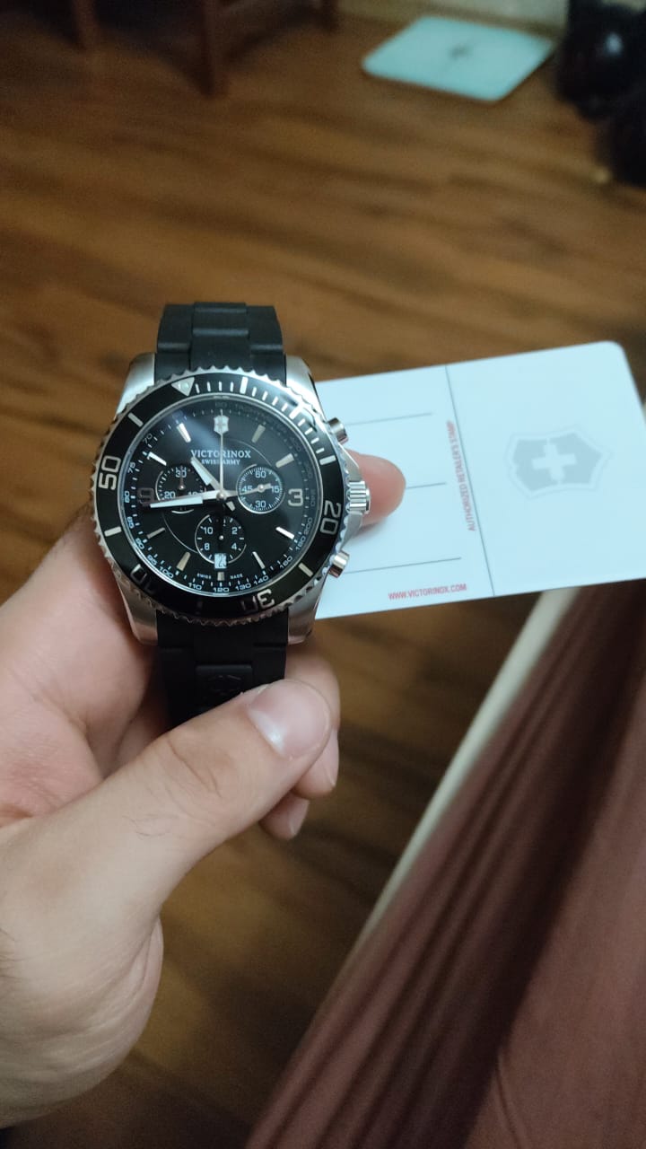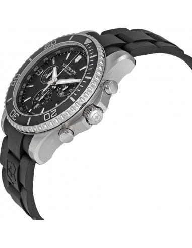 Мужские швейцарские часы- хронографХронографФункция позволяет измерять отрезки времени с особой точностью: часы, минуты, секунды. Верным признаком хронографа является наличие на циферблате 3 дополнительных окошек-счётчиков. Victorinox Maverick 241696, кварцевый механизм с высокой точностью. Сапфировое стеклоСапфировое стеклоПрочный и надёжный материал из кристалла сапфира синтетического происхождения, характеризующийся особой твёрдостью и устойчивостью к царапинам и повреждениям. с трёхслойным антибликовым покрытием. Часы с секундомеромСекундомерСекундоме́р — прибор, способный измерять интервалы времени с точностью до долей секунды. и тахиметромТахиметрРазмеченная шкала, располагается на ободке или безеле часов. Тахиметр позволяет рассчитать скорость на определённом участке пути, расстояние измеряется в километрах или милях.. Корпус часов выполнен из нержавеющей стали 316L. Вращающийся стальной безельБезельВнешний ободок, закрепляющий стекло. В спортивных часах так называется поворотное кольцо с делениями на циферблате, выполняет роль таймера – замеряет отрезки времени на шкале. Неподвижный безель – элемент декора. Однонаправленно вращающийся безель на дайверских часах позволяет фиксировать моменты погружения и выныривания на поверхность. с PVD-покрытиемPVDУльтратонкое покрытие наносится в технике вакуумного напыления, сочетает в себе нитрид титана особой прочности со слоем золота или оксида хрома. Несёт в себе декоративную или защитную функцию.. Стрелки с люминесцентным покрытиемЛюминесцентное покрытиеПозволяет считывать показания времени в темноте. Производители наносят на стрелки, часовые индексы, безель или поверхность циферблата светонакопительный состав, дающий холодное свечение.. Класс водозащиты: 100 метров, позволит плавать, нырять и заниматься другими водными видами спорта. Каучковый ремешок на стандартной застежке.
