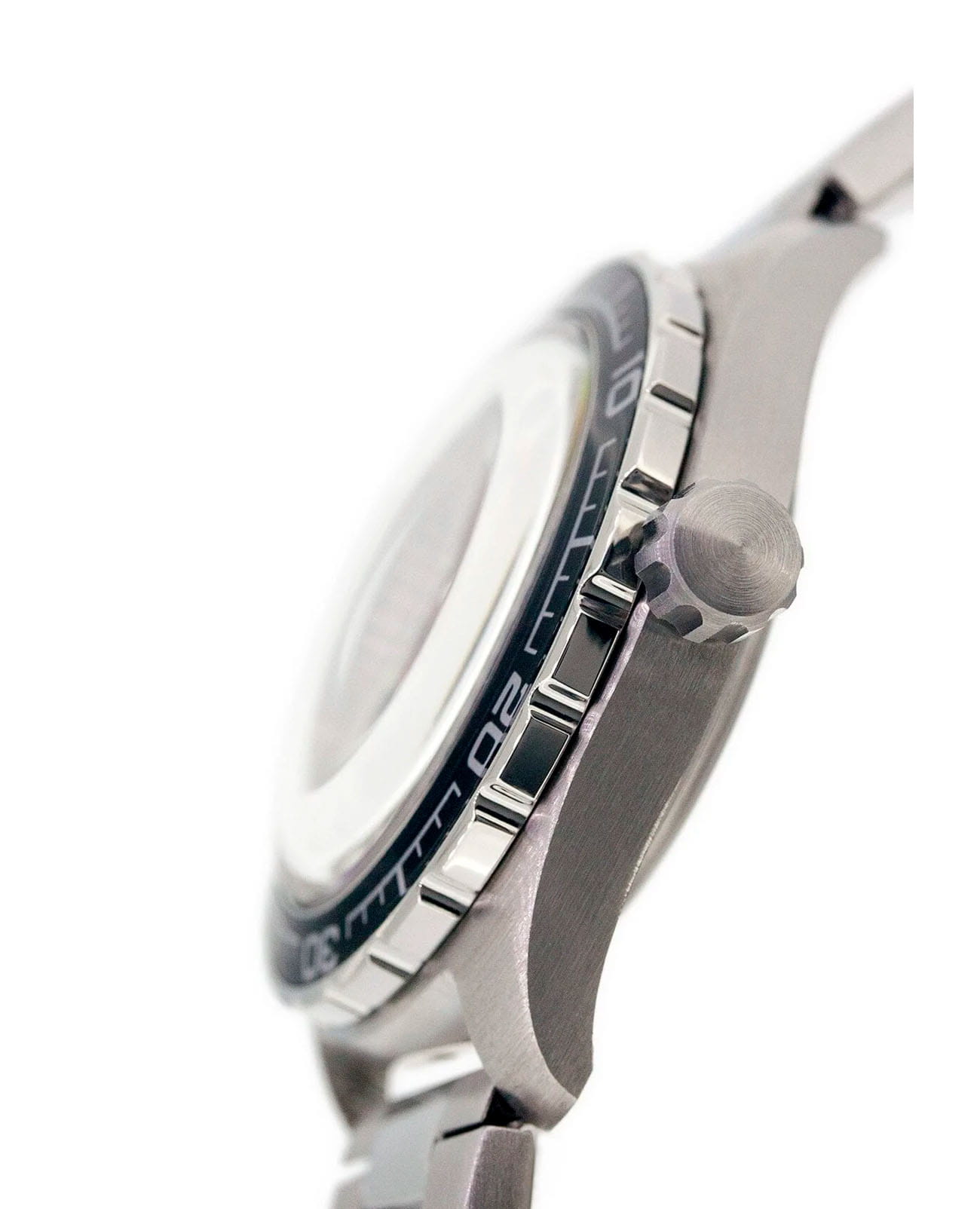 БезельБезельВнешний ободок, закрепляющий стекло. В спортивных часах так называется поворотное кольцо с делениями на циферблате, выполняет роль таймера – замеряет отрезки времени на шкале. Неподвижный безель – элемент декора. Однонаправленно вращающийся безель на дайверских часах позволяет фиксировать моменты погружения и выныривания на поверхность. с PVD-покрытиемPVDУльтратонкое покрытие наносится в технике вакуумного напыления, сочетает в себе нитрид титана особой прочности со слоем золота или оксида хрома. Несёт в себе декоративную или защитную функцию.. Диаметр корпуса составляет 41 мм, что делает модель универсальной для любого запястья.