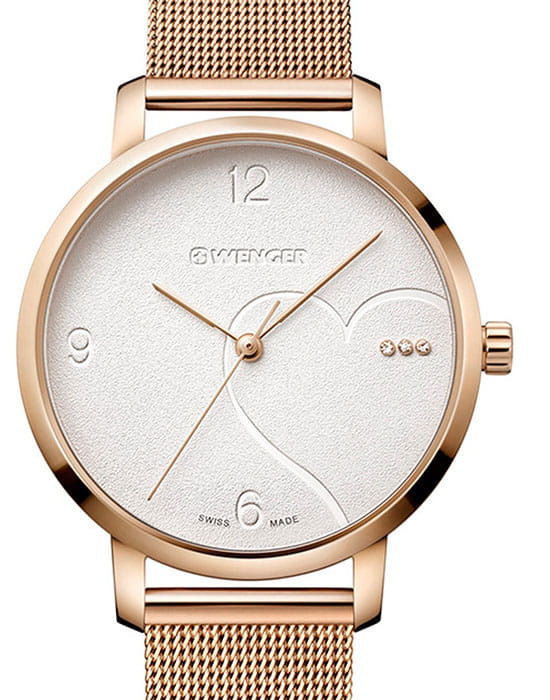 Женские швейцарские часы с кристаллами Swarovski Wenger 01.1731.112, кварцевый механизм с высокой точностью. Класс водозащиты: 100 метров, позволит плавать, нырять и заниматься другими водными видами спорта. Корпус часов изготовлен из стали, золотистого цвета.